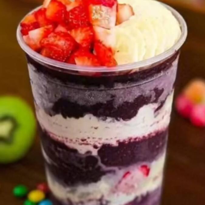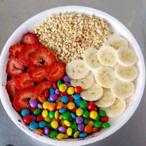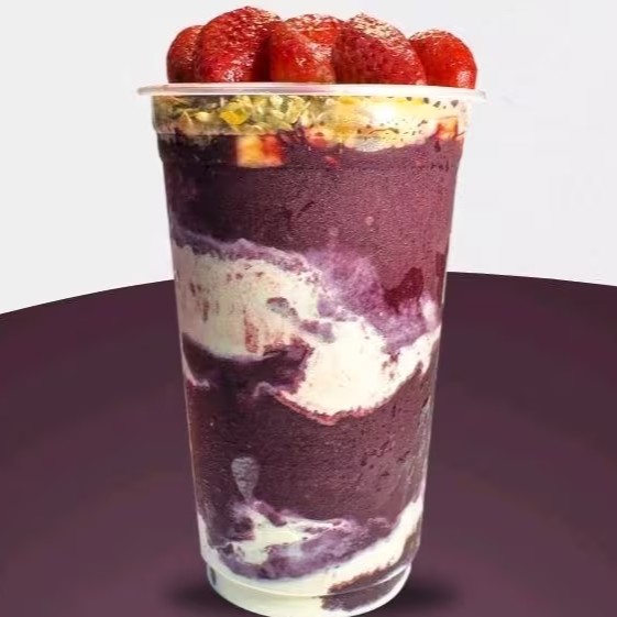 Delicioso açaí cremoso recheado com camadas com ingredientes da sua escolha