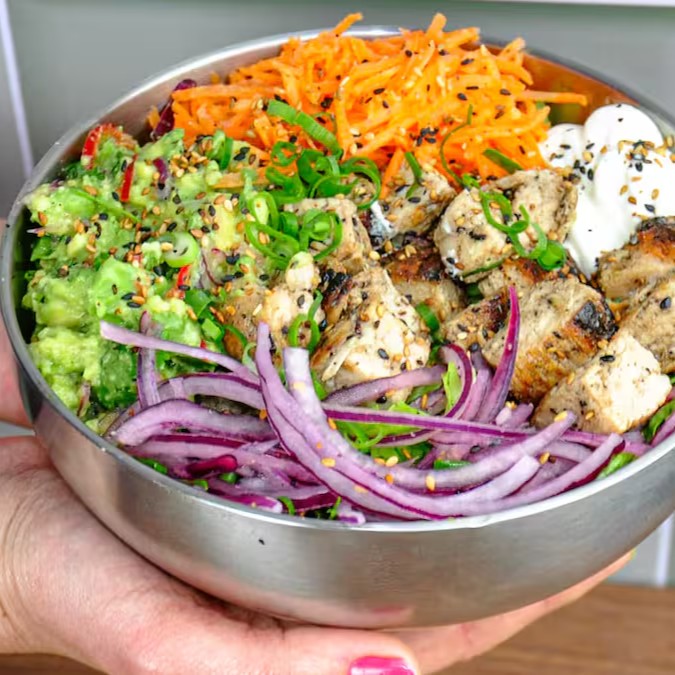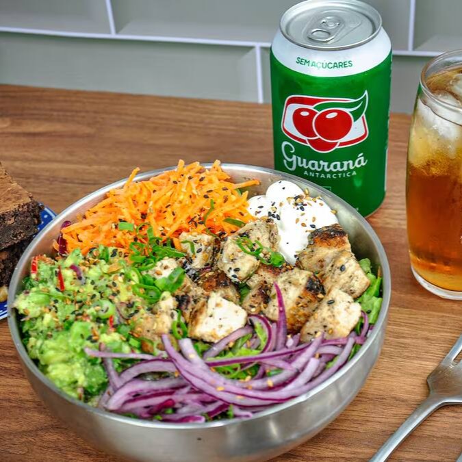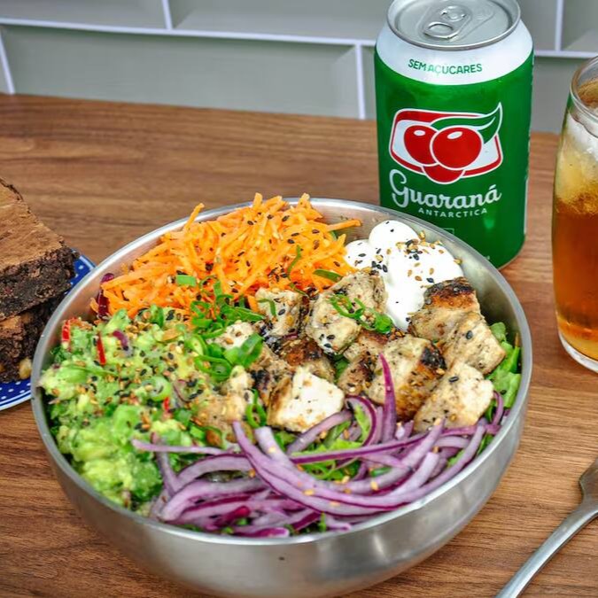 Um prato equilibrado e delicioso! Combine um mix de folhas frescas com cubos de frango grelhado suculento, guacamole cremoso (feito com abacate, limão, cebola roxa, pimenta dedo de moça, coentro, sal e pimenta do reino), cenoura crocante, cebola roxa, cream cheese e chips de batata-doce irresistíveis. Finalize com o molho de sua preferência e dê o seu toque especial. Perfeito para quem busca uma refeição saudável, saborosa e cheia de frescor.