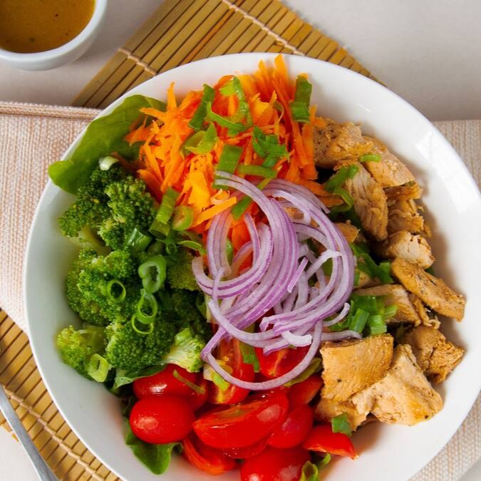 Mix de folhas, frango grelhado, tomate cereja, cenoura, cebola roxa, cream cheese. Acompanha chips de batata doce. Escolha o molho de sua preferência e finalize como desejar :)