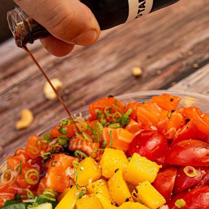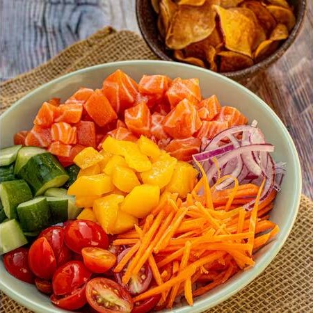 Poke com arroz japonês temperado, salmão fresco em cubos (cru ou grelhado), cebola roxa, cenoura, pepino, tomate cereja, manga e nori (alga desidratada). Completo com chips crocantes de batata-doce e finalizado com molho tarê (adocicado à base de shoyu), cebolinha e gergelim. Um poke saudável, fresco e cheio de sabor, perfeito para quem busca uma refeição leve e nutritiva.