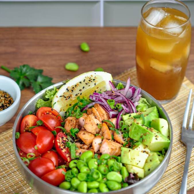 Poke com arroz japonês temperado, mix de folhas frescas e salmão em cubos (cru ou grelhado). Inclui edamame, sunomono, nori (alga desidratada) e chips crocantes de batata-doce. Finalizado com molho Ponzu (cítrico à base de shoyu, limão e laranja), gergelim e raspas de limão siciliano. Uma opção leve, saudável e cheia de sabor para quem busca uma refeição fresca e nutritiva.