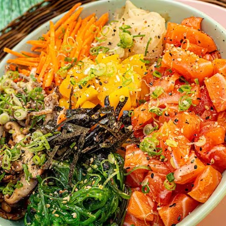 Poke especial com arroz japonês temperado e salmão fresco em cubos (cru ou grelhado). Inclui cenoura, cogumelo shitake salteado na manteiga, manga, gengibre em conserva, nori (alga desidratada), wakame (salada japonesa de algas e gergelim) e cebola crispy. Finalizado com molho clássico de shoyu, óleo de gergelim e gengibre, além de cebolinha e gergelim. Uma opção saudável, saborosa e leve para quem busca frescor e autenticidade em Campinas!