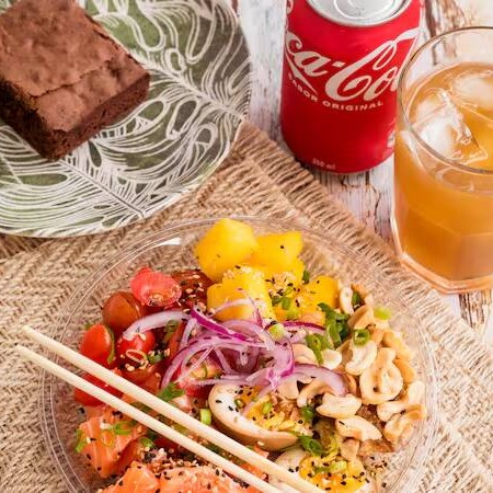 Poke completo com salmão fresco (cru ou grelhado) 80g, arroz japonês temperado, mix de folhas, sunomono, tomate cereja, manga, cebola roxa, cebolinha e gergelim. Com a crocância dos chips de batata-doce e couve crispy, finalizado com molho tarê exclusivo (molho adocicado e à base de shoyu). Uma opção saudável, leve e deliciosa para quem busca frescor e sabor!