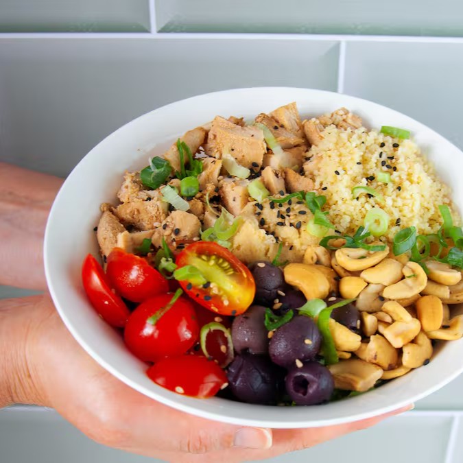 Uma combinação perfeita de sabores e saúde! Nosso prato traz filé de frango grelhado em cubos, couscous marroquino, homus de gão de bico, mix de folhas frescas, tomate cereja, azeitona preta e castanha de caju. Escolha o molho de sua preferência para realçar os sabores e finalize com o toque especial que você adora. Ideal para quem busca uma refeição leve, nutritiva e cheia de sabor. Peça agora e experimente o equilíbrio perfeito entre tradição e frescor!
