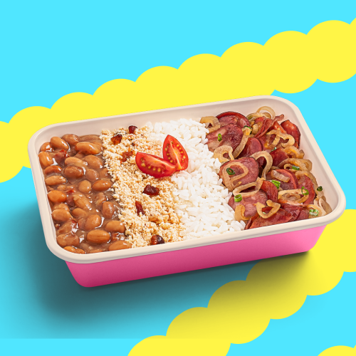 Calabresa fatiadinha e bem acebolada, com a poderosa farofa de bacon, um irresistível arroz, feijão delícia, tomate-cereja, salsinha, cebolinha e azeite temperado para você agradecer ao universo por ter tanto sabor.
