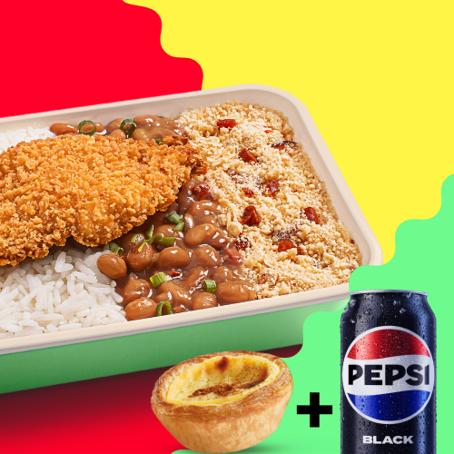 Filé de frango empanado e bem acompanhado: com um delicioso arroz, um feijão bem saboroso, salsinha, cebolinha, tomate-cereja e uma farofa de bacon que dispensa comentários. Até porque não dá pra falar de boca cheia, né? Acompanha 1 Refrigerante Lata + 3 Minichurros de Doce de leite ou 1 Pastel de Belém. Só vem!