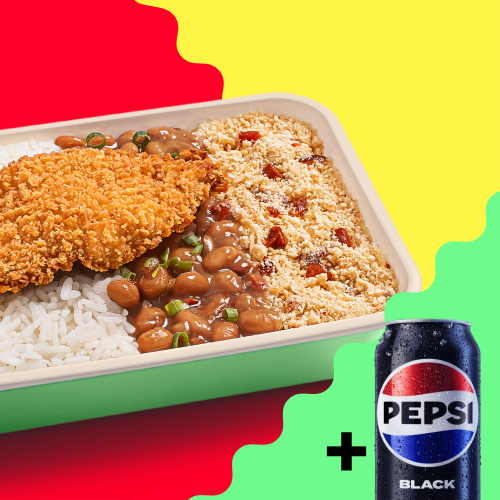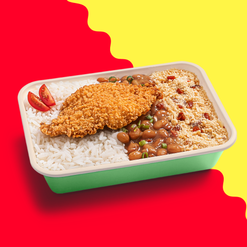 Filé de frango empanado e bem acompanhado: com um delicioso arroz, um feijão bem saboroso, salsinha, cebolinha, tomate-cereja e uma farofa de bacon que dispensa comentários. Até porque não dá pra falar de boca cheia, né? Acompanha 1 Refrigerante Lata.