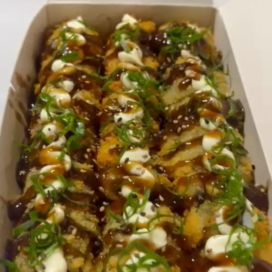 Arroz japones,Sunomono,,Amendoin, Couve Crispy batata Crispy,Salmao grelado,Creme chesse