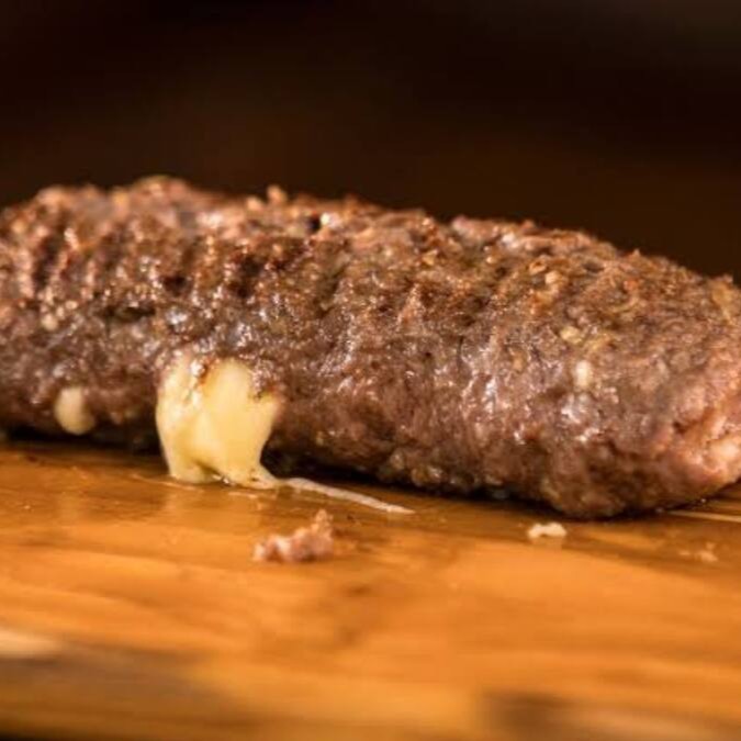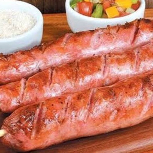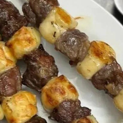 Deliciosa jantinha com mandioca, vinagrete, molho de alho, farofa com bacon e calabresa, e o espetinho [carne ou linguiça]