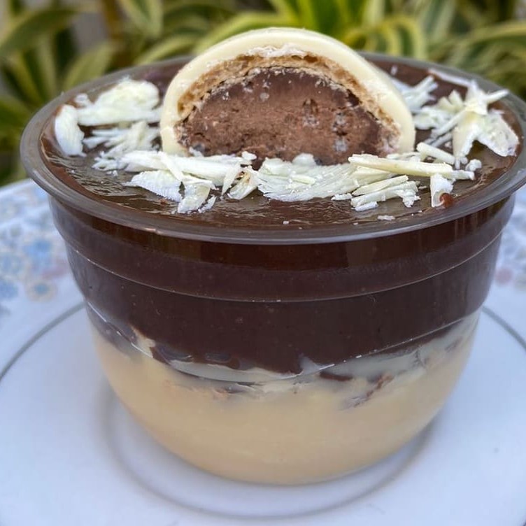 Ingredientes: creme branco, creme de chocolate e pedaços de bombom Ouro Branco.