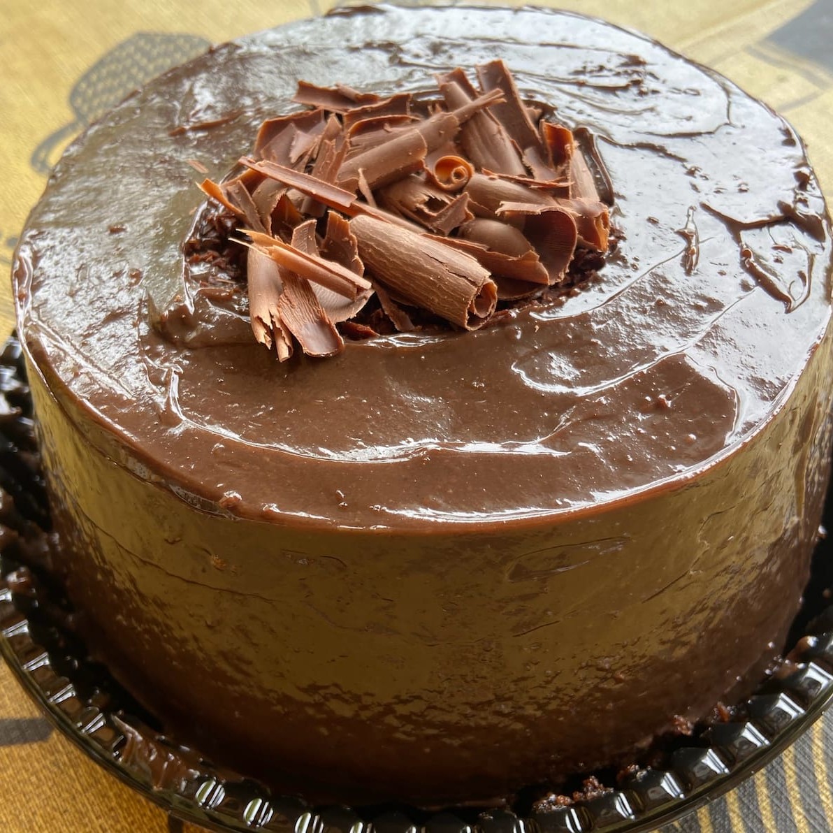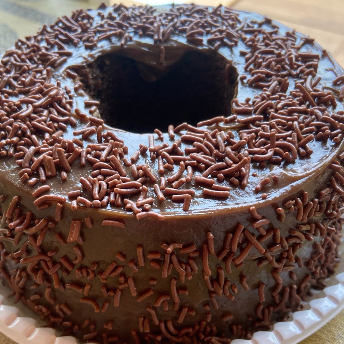 Massa de chocolate com brigadeiro e raspas de chocolate meio amargo.