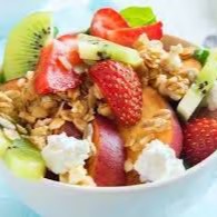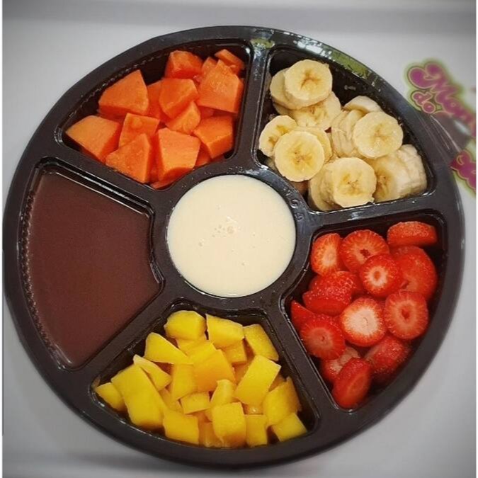 Banana, morango, mamão, melão, manga, abacaxi, maçã, leite condensado e granola.
