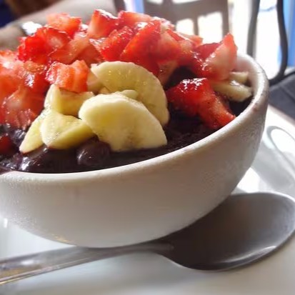Açaí, leite condensado, leite em pó, banana e morango.