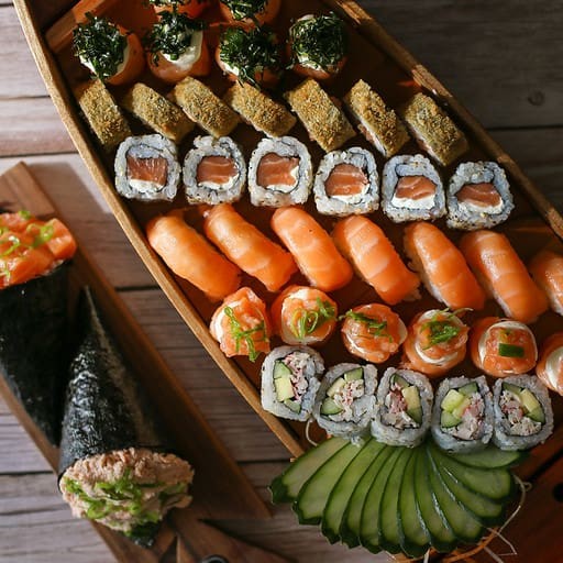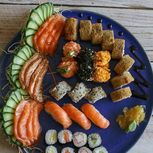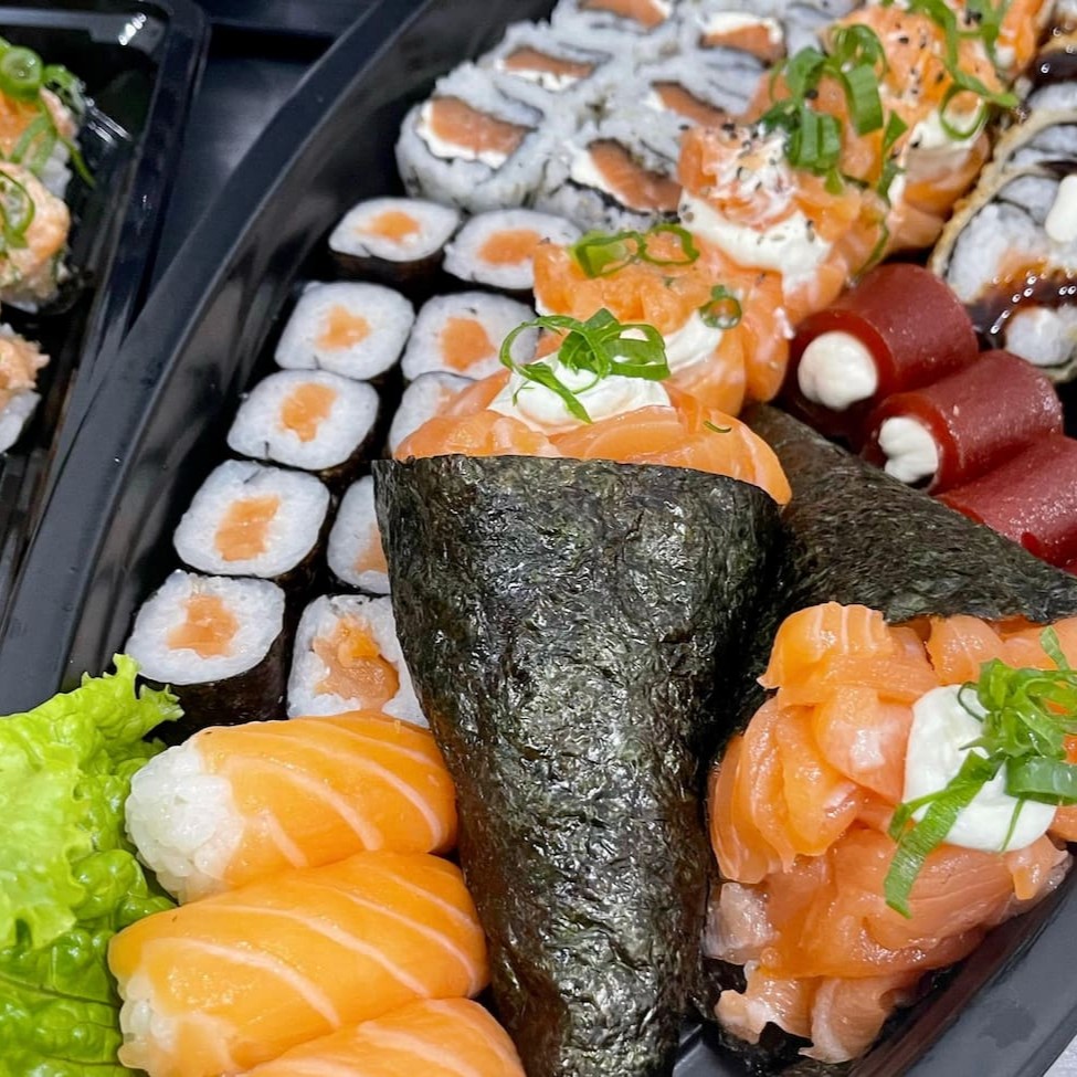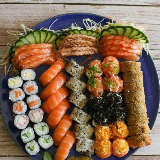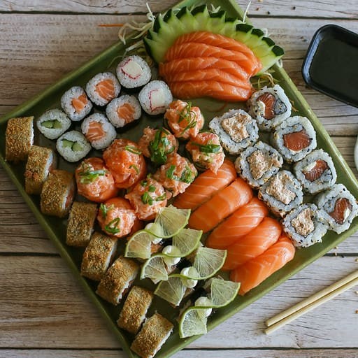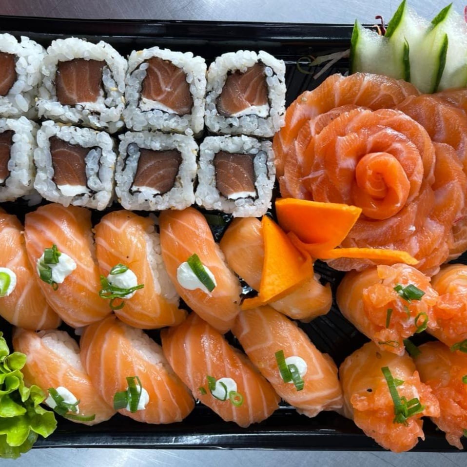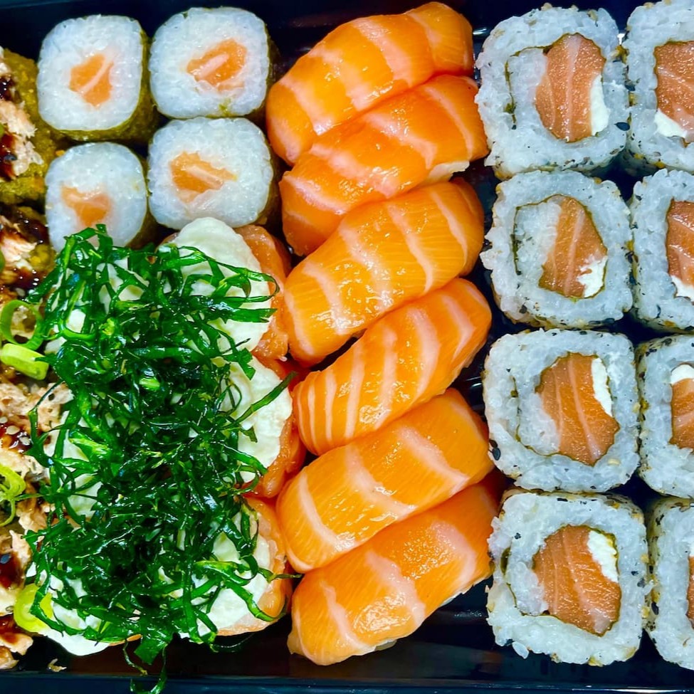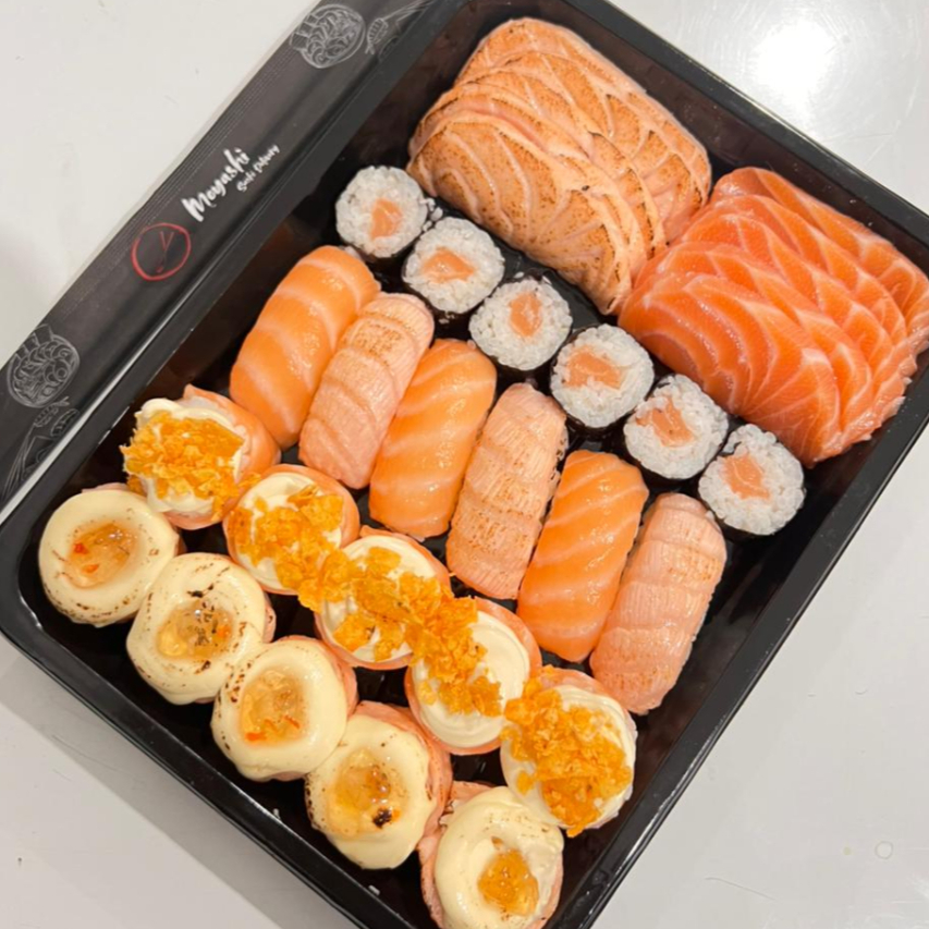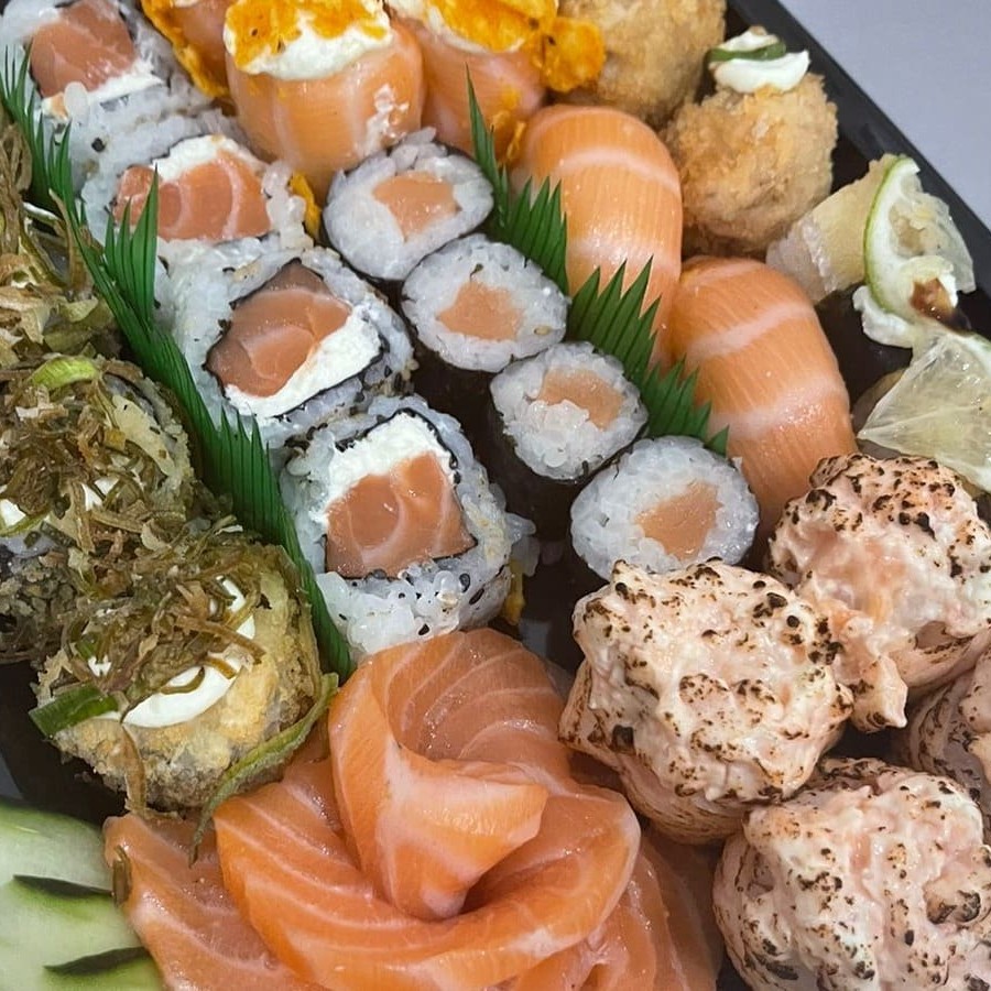 **Combo sem troca de peças** 4 sashimi simples 4 hot crispy 4 uramaki salmão 4 jyo nacho 4 jyo macaricado 4 hossomaki salmão 2 niguiri skin 2 niguiri salmão 3 bolinho salmão