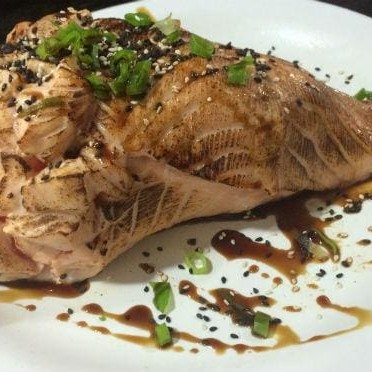 Fatias de peixe(salmão ) flambado com tarê, cebolinha e gergelim