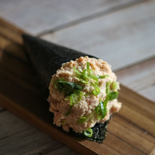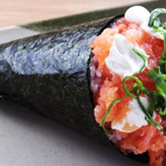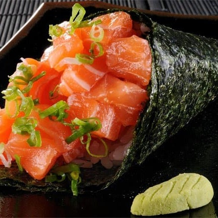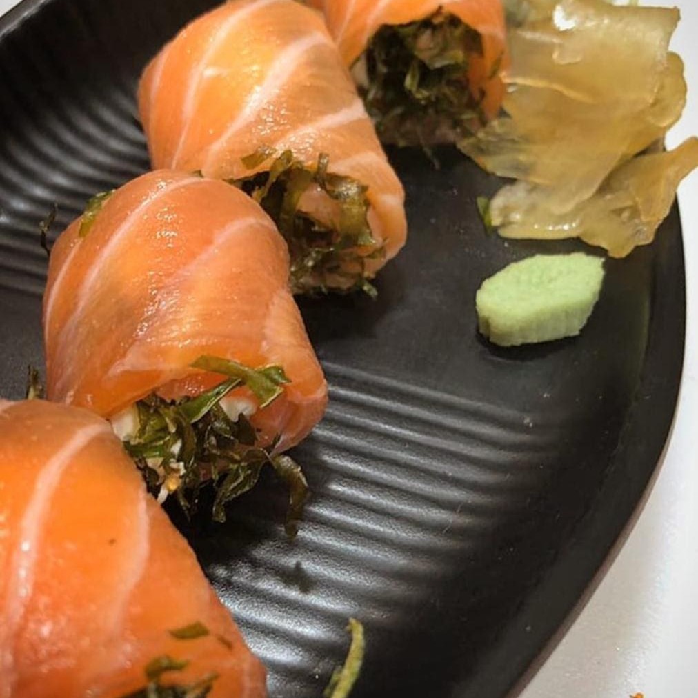 Cobertura de tartar de salmão, cream cheese e cebolinha, enrolado com alga por dentro