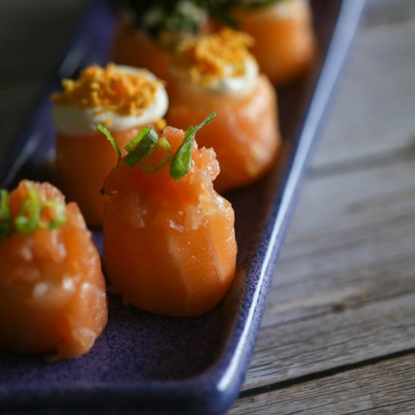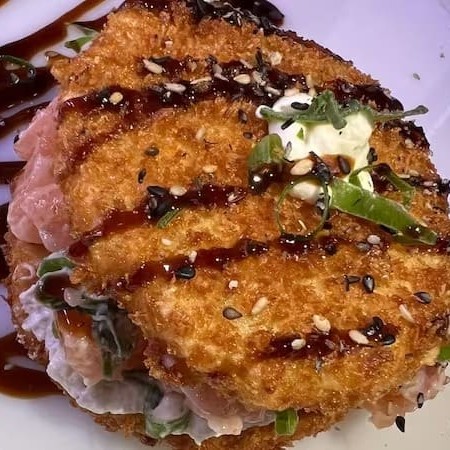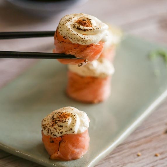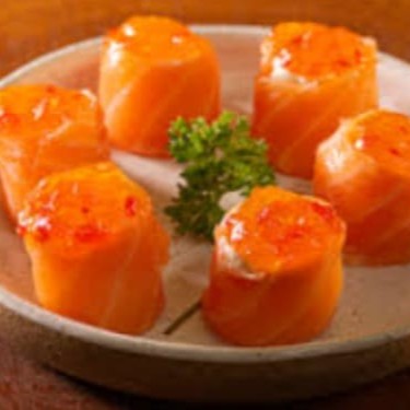 Bolinho de arroz envolto de lamina salmão com cobertura de peixe cream cheese e cebolinha.