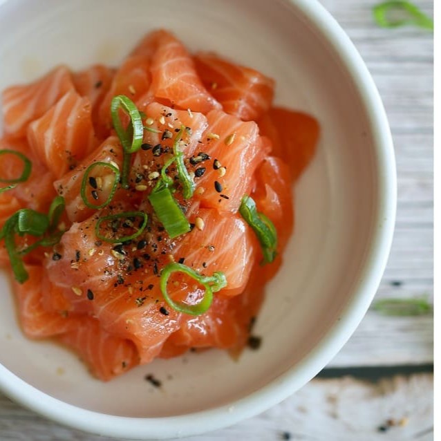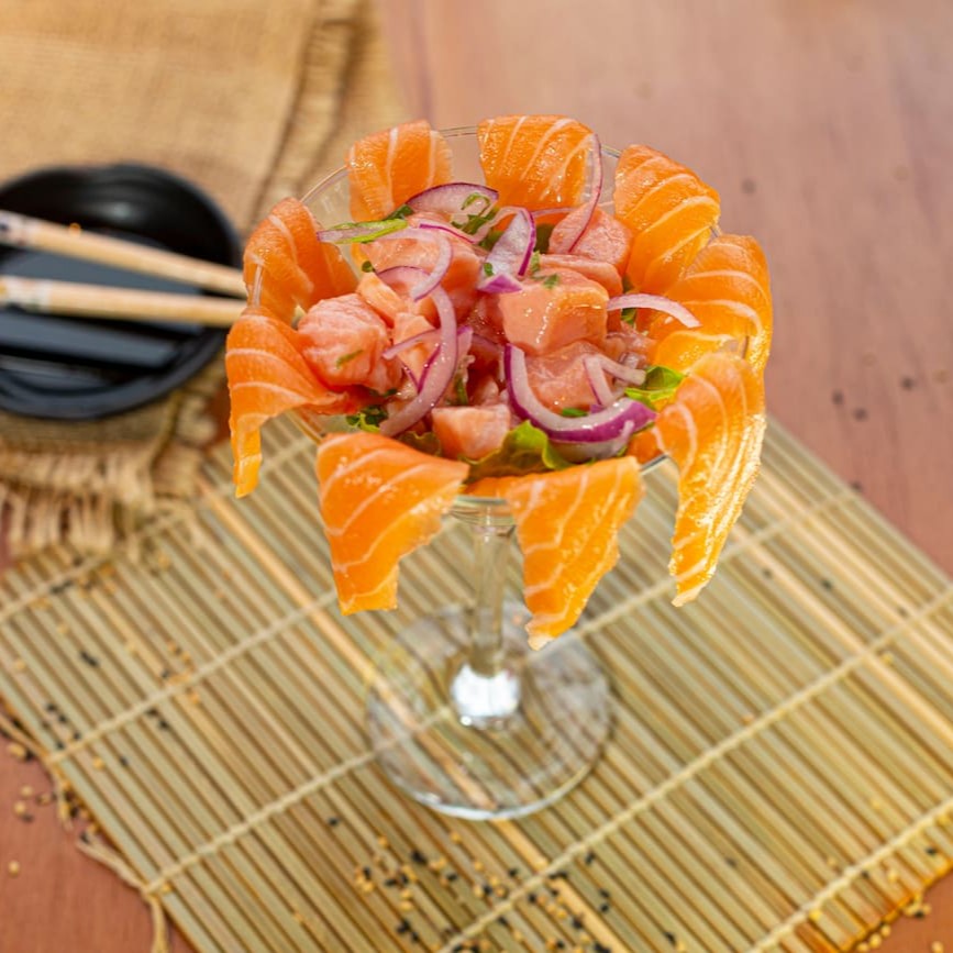 Pequenos cubos de salmão temperados com gergelim óleo de gergelim cebolinha e especiarias e um delicioso tempero da casa. (200g)