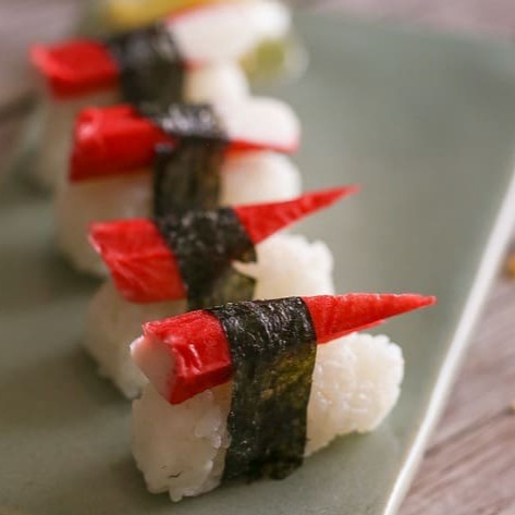 Carne de peixe sabor carne de caranguejo, enrolado com alga por fora