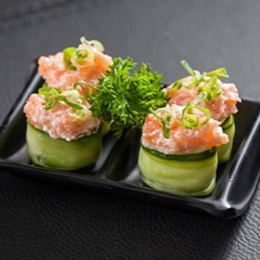 Fatia de pepino com arroz ecobertura de salmão, cream cheese e cebolinha