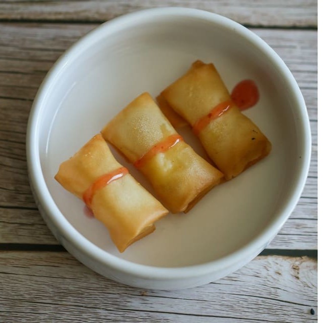 **Massa fina crocante recheada de mussarela, acompanha molho agridoce (5 unidades) **