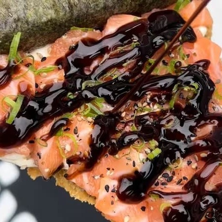 Bolinho de arroz envolto em lamina de salmão com cobertura cream cheese e geleia de pimenta.