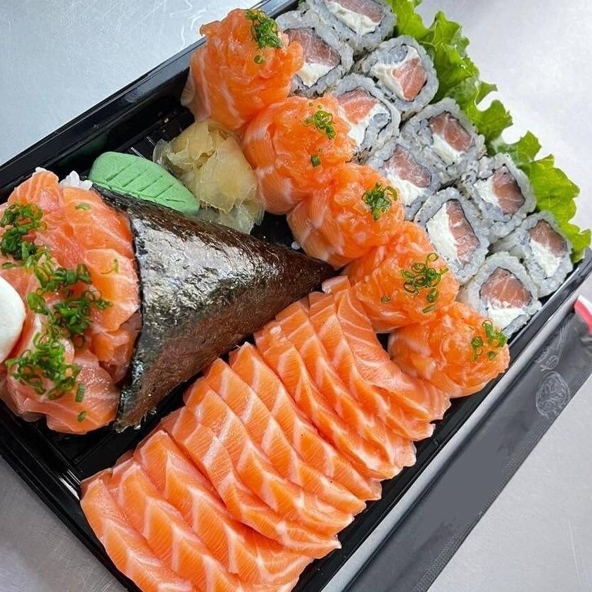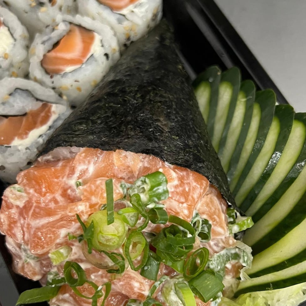 1 Temaki salmão completo 2 Niguiri Salmão 2 Jyo Pepino 2 Hossomaki Salmão 4 Hot Roll 1 refrigerante lata 350 ml a escolha da casa **foto ilustrativa** ** Sem Alteração De peças **