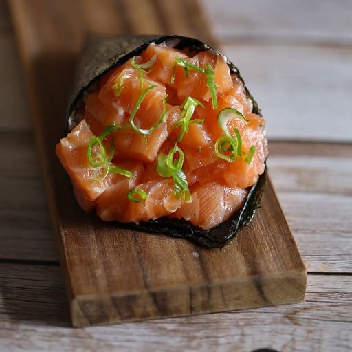 Salmão fresco, enrolado com alga por fora