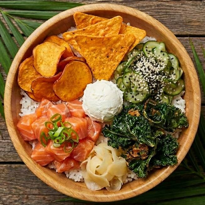 Base De Arroz Com Molho Especial, Salmao cru, chips de batata, cream cheese, cebolinha, nacho, cryspi, sunomono, gengibre (450g)