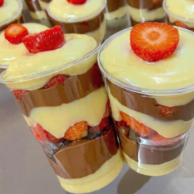 morango e cremes de chocolate e ninho. 250 ml