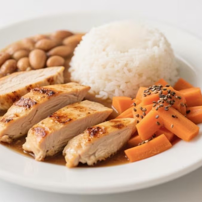 Este prato é uma deliciosa combinação de peito de frango grelhado, arroz jasmim e feijão, acompanhados de um mix de cenoura e chia. É nutritivo e equilibrado, proporcionando uma sensação de saciedade.