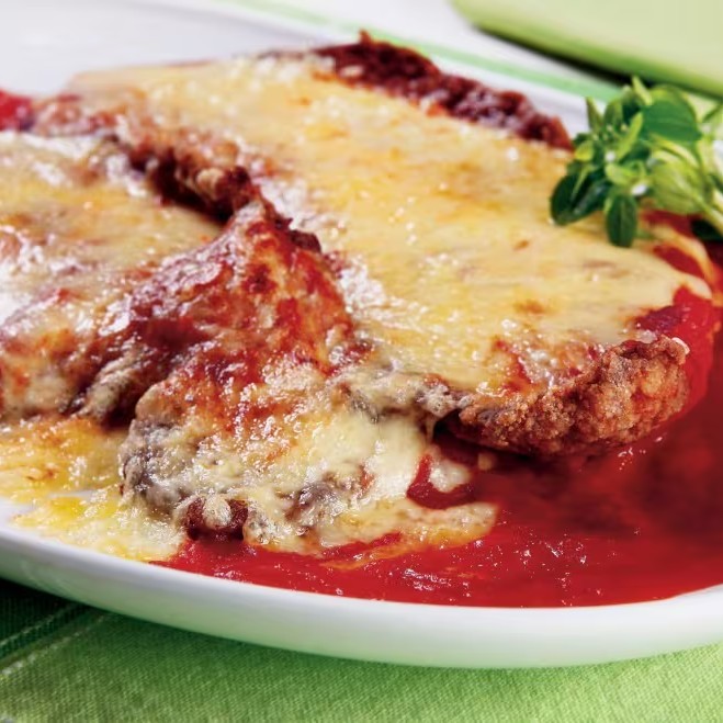 Generoso Filé de Frango Parmegiana ao Refinado Molho de Tomate Italiano com Muito Queijo.