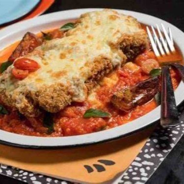 Generoso Bife Parmegiana de Contra Filet ao Refinado Molho de Tomate Italiano com Muito Queijo.