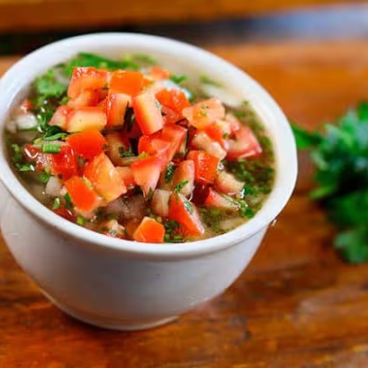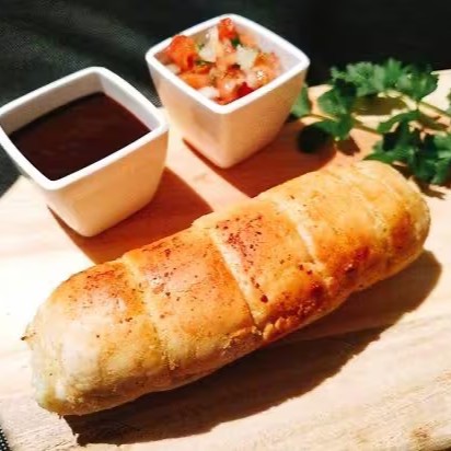 Pão francês, espeto tradicional, mussarela, vinagrete, catupiry e maionese de alho defumado.