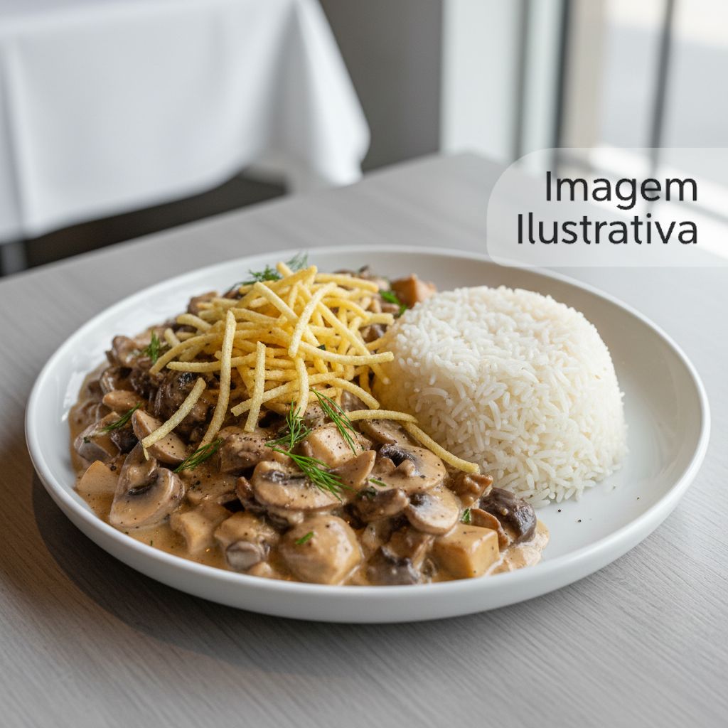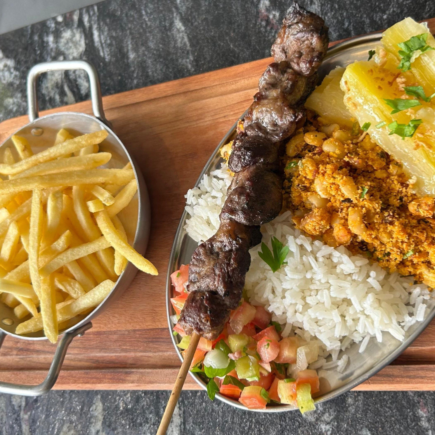 Arroz, Farofa do Mu, Vinagrete, Batata Frita e Espeto Tradicional