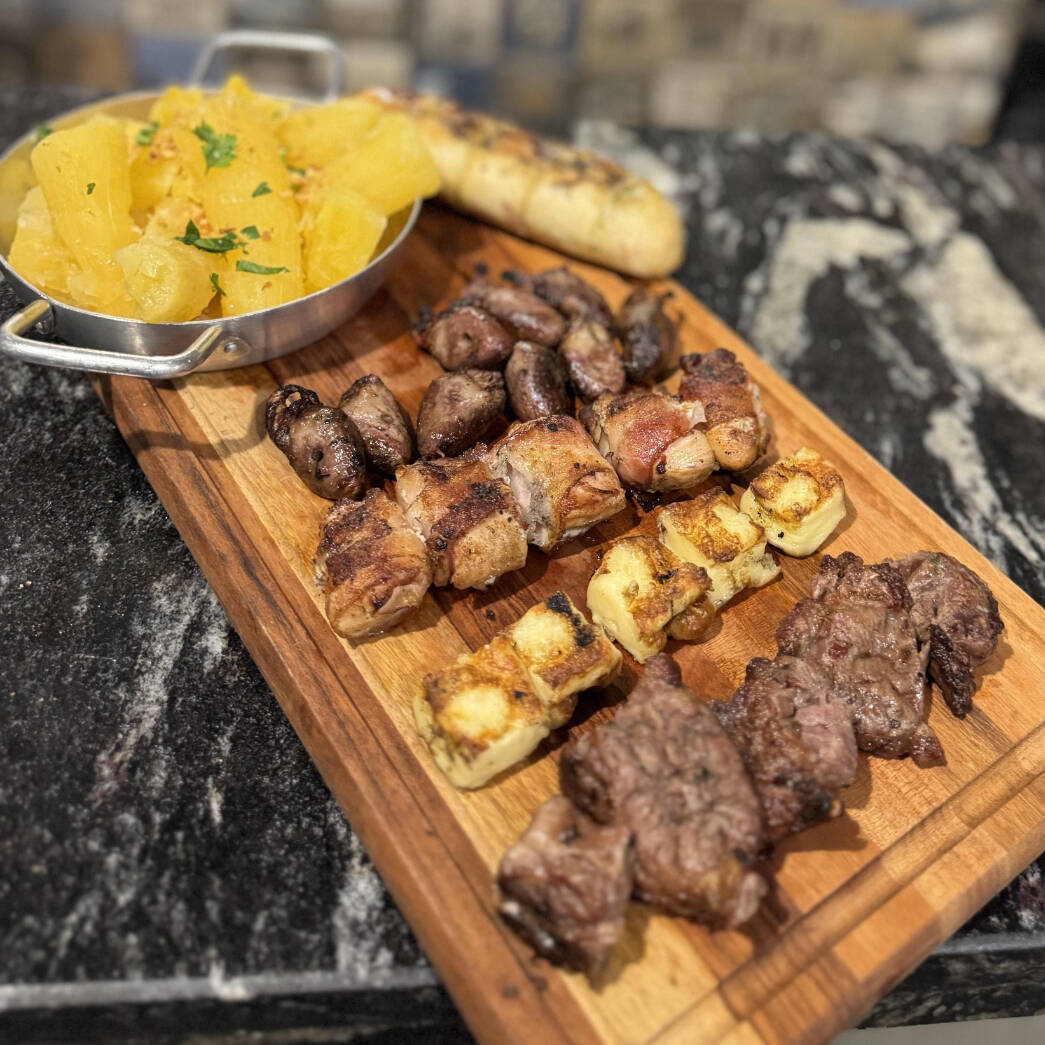 Costela, Queijo, Medalhão de Frango, Coração, Pão de Alho e Mandioca Amanteigada