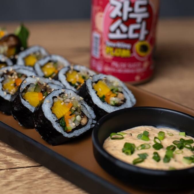 Gimbap - Rodelas de arroz cozido, recheado com vegetais, carne, envolto com algas marinhas.