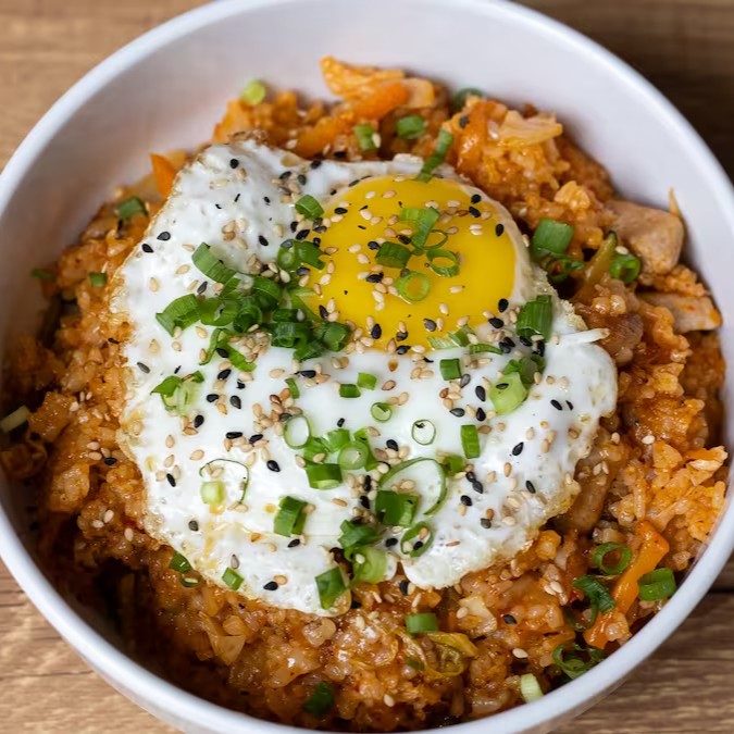 Arroz frito com kimchi, legumes, carne suína e ovo.