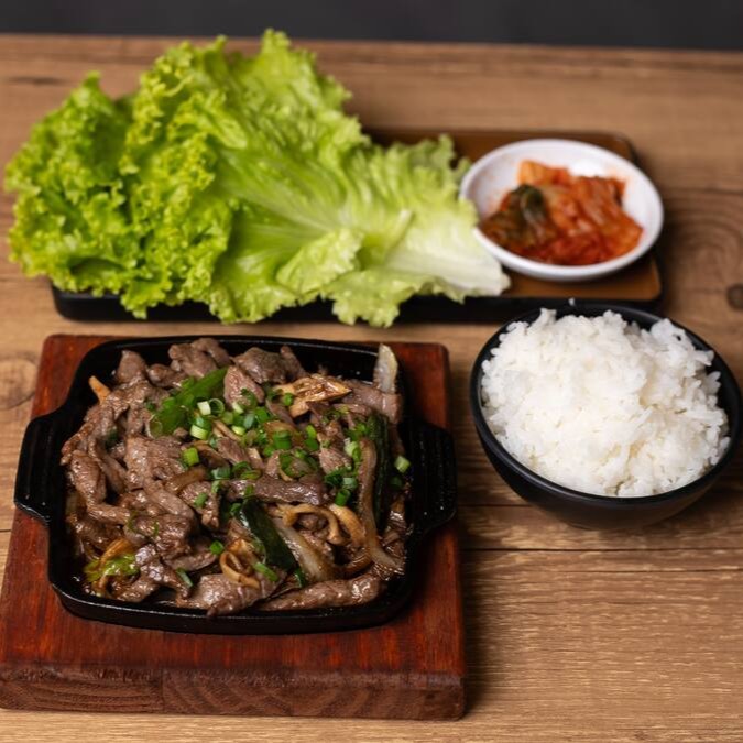 Finas lascas de carne marinadas em molho de shoyu, levemente adocicado, com cebola, cebolinha e shimeji. Acompanha 1 porção de arroz, alface e Kimchi.