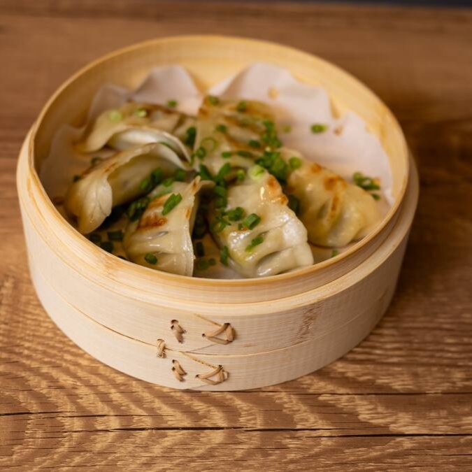 Porção de guiozas (6 unidades) recheadas com vegetais, cozidas no vapor e grelhado.