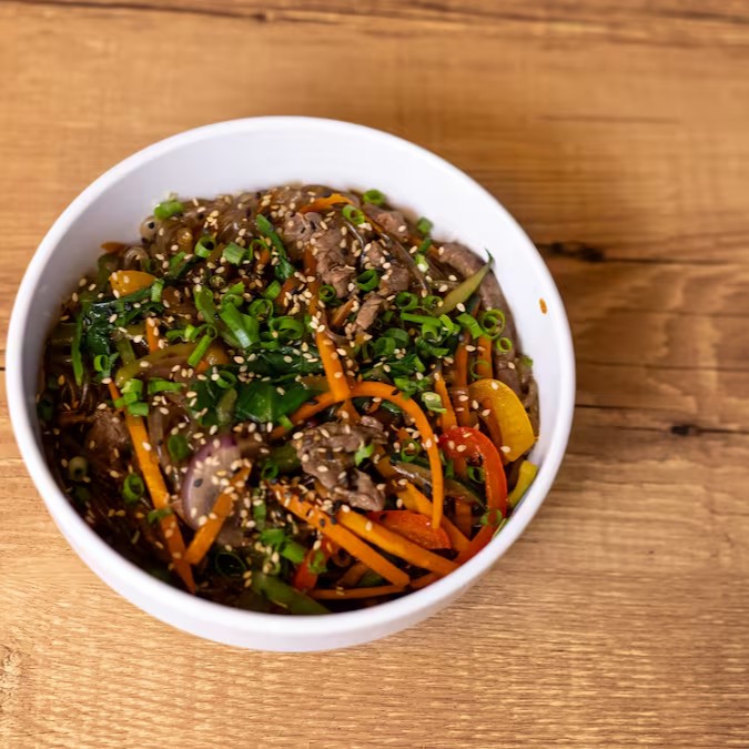 Japchae - Macarrão de batata doce acompanhado de vegetais e carne