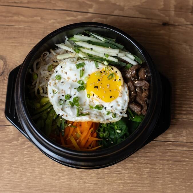 Vegetais salteados com arroz, ovo frito, molho picante gotchujang e finalizado com cebolinha.