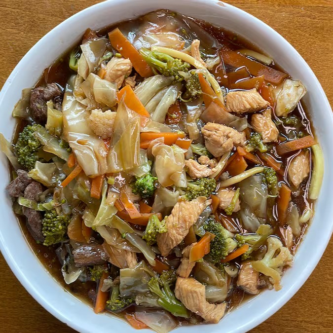 Peixe branco suave e fresco com arroz e tempero oriental.
