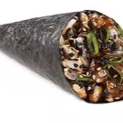 Cone de alga recheado com cubos frescos de atum e arroz japonês.