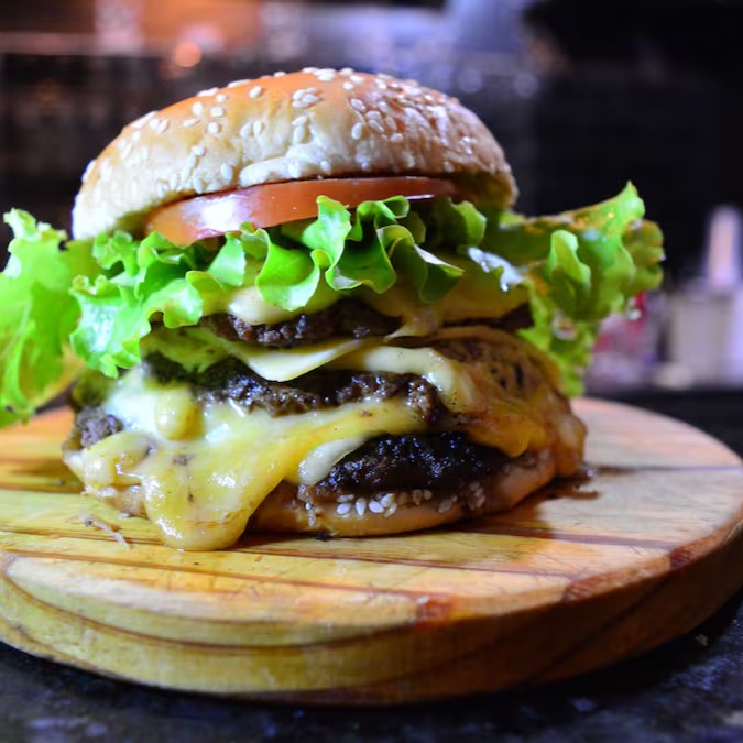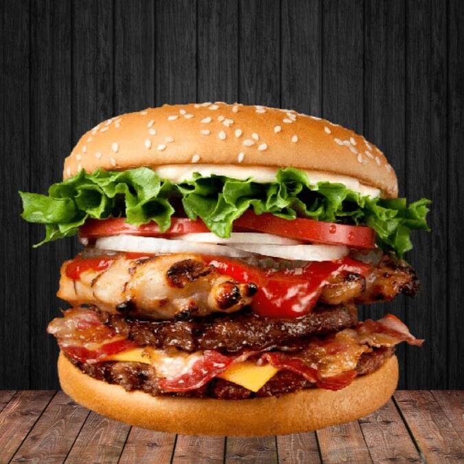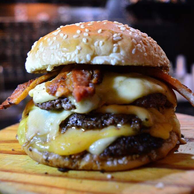 Se você é fã de bacon, essa é a sua nova paixão! Imagine três suculentas camadas de carne, perfeitamente grelhadas e crocantes, combinadas com fatias generosas de bacon defumado que trazem um sabor irresistível a cada mordida.
