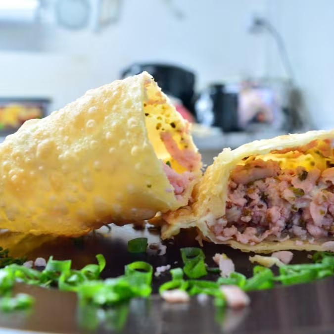 Delicioso e bem fritinho, Pastel da Casa recheado com Frango desfiado temperadinho