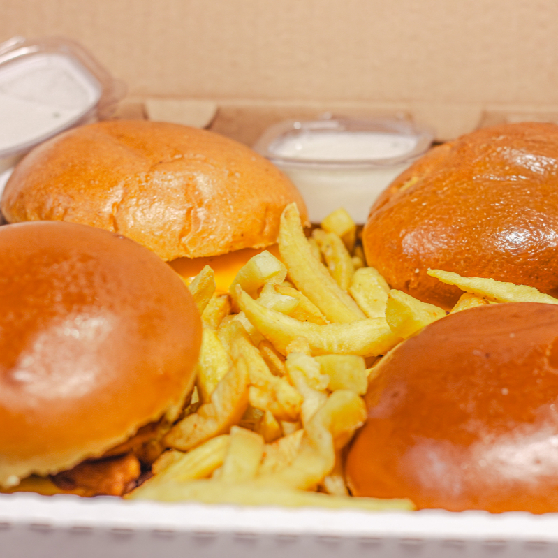 Deliciosa Burger In Box com 4 Lanches + Batata Frita [ Não Acompanha Bebida ]