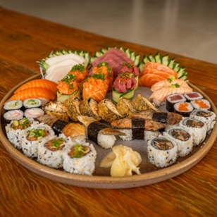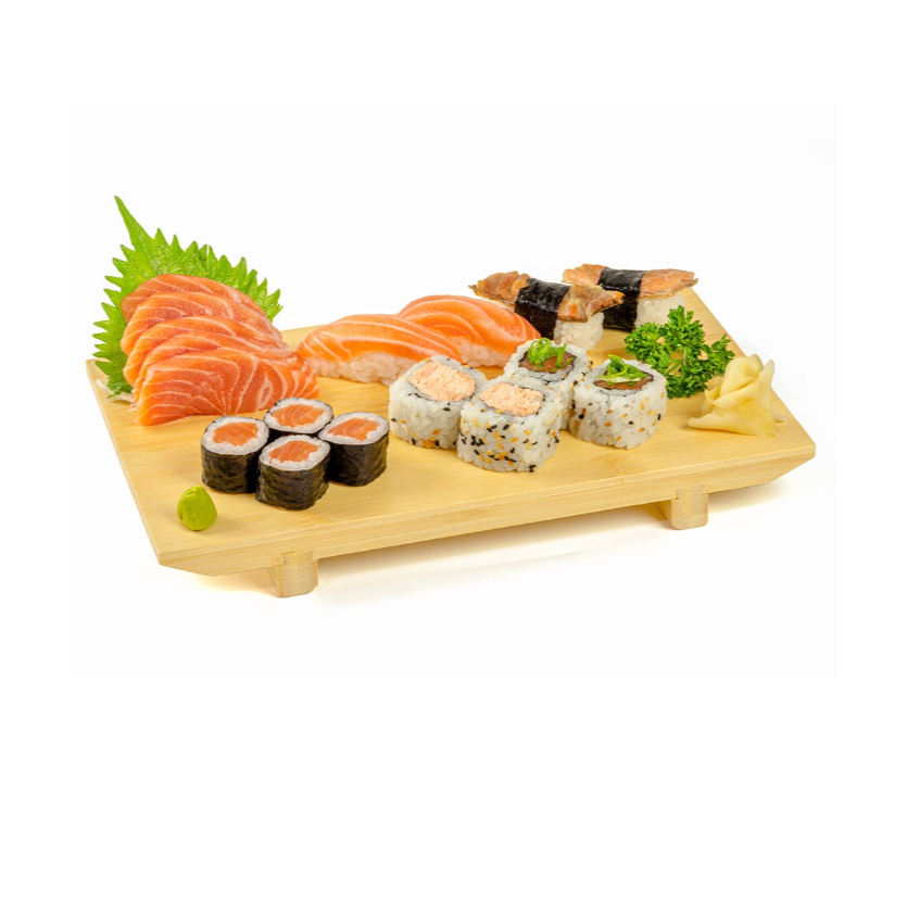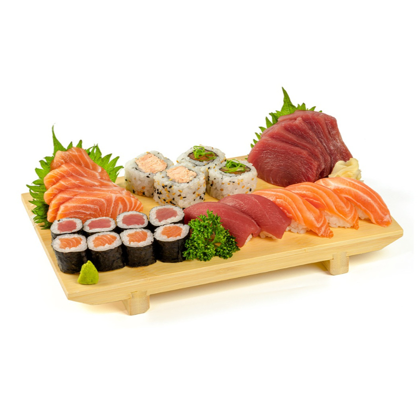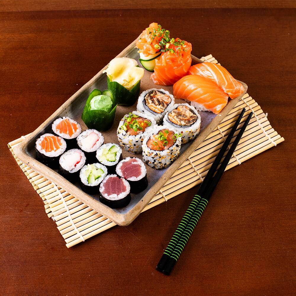 5 sashimis de salmão, 5 sashimis de atum, 3 niguiris de salmão, 2 niguiris de atum, 2 uramakis de salmão e cebolinha, 2 uramakis de salmão assado, 4 hossomakis de salmão e 4 hossomakis de atum. (540 g) - **Obs.: não é possível realizar trocas de peças *Obs.: não acompanha hashi, berço e shoyu