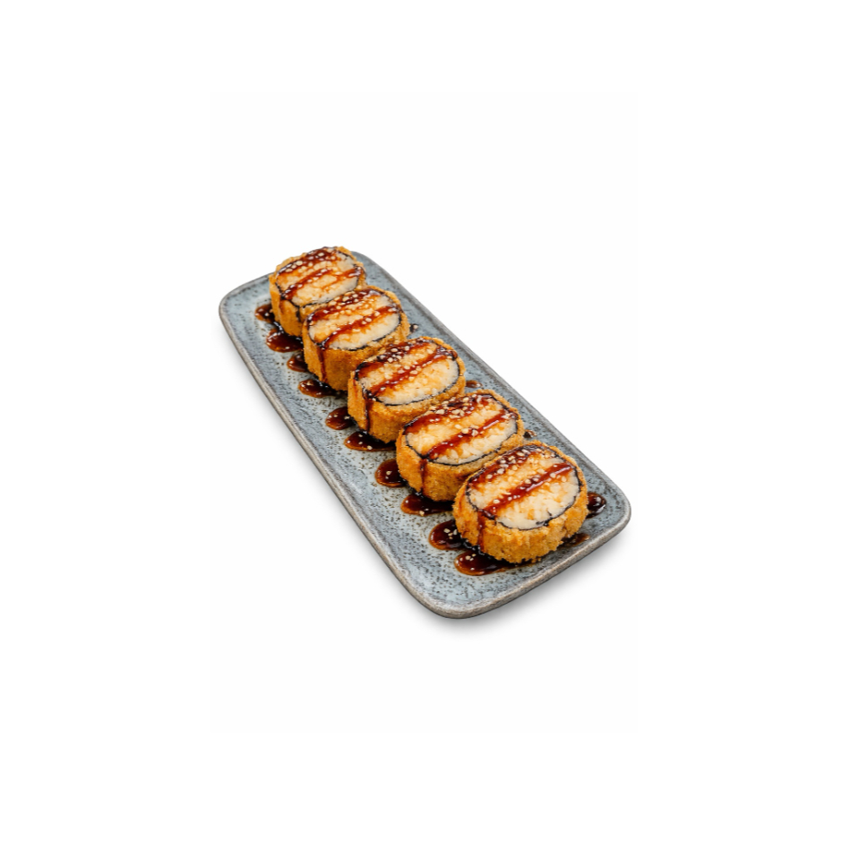 5 unidades de sushi empanado e frito recheado com salmão assado e cream cheese. Acompanha molho tarê. *Obs.: não acompanha hashi, berço, shoyu, wasabi e gengibre