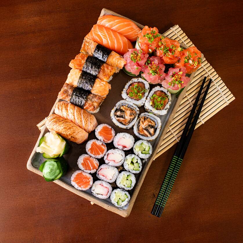 3 sashimis de peixe branco, 3 sashimis de salmão, 3 sashimis de atum, 2 Joes de pepino com salmão e cebolinha, 2 Joes de salmão e cebolinha, 2 Joes de pepino com atum, togarashi e cebolinha, 2 hossomakis de pepino, 2 hossomakis de atum, 2 hossomakis de salmão, 2 hossomakis de kani, 2 niguiris de salmão maçaricado, 2 niguiris de salmão, 4 niguiris de skin 4 uramakis de salmão e cebolinha e 4 uramakis de skin e 6 hot rolls.(900 g) - **Obs.: não é possível realizar trocas de peças *Obs.: não acompanha hashi, berço e shoyu